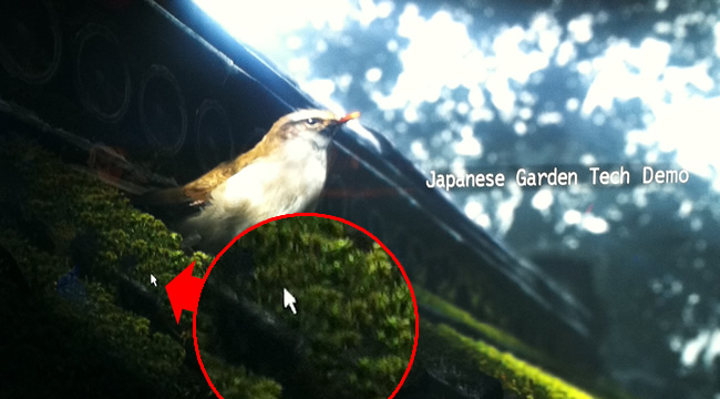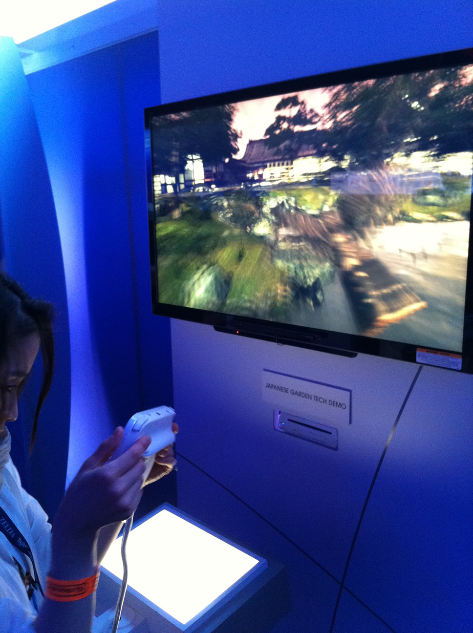 Ad un certo punto la demo di Japanese Garden è andata in crash. Al riavvio è successa una cosa un pò spiacevole! Nulla toglie alla pregevolezza della Demo, veramente spettacolare e sopratutto in Real Time, oltretutto individuale, TV e Controller creavano 2 diverse scene e quella sul controller aveva la visuale completamente gestibile via giroscopio (in quella sulla TV si poteva comunque muovere la telecamera, in contemporanea). Il potere computazionale di WiiU è assicuratissimo. Ma per ora è ancora un prototipo ed io sono rimasto troppo scottato da una demo simile vista all’ annuncio del gamecube!
